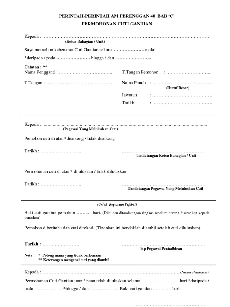 Contoh surat permohonan untuk berbagai keperluan seperti permohonan bantuan dana, izin kerjasama / rekomendasi, beasiswa karena mengajukan permohonan kepada (atau dari) pimpinan perusahaan, instansi atau ormas tertentu, tidak sesederhana meminta bantuan pada sesama teman. Setiap karyawan memiliki hak cuti tahunan yang dapat diambil beberapa kali atau sekaligus. Sekolah adalah tempat belajar dan menuntut ilmu. Kelab contoh borang keahlian persatuan : Selain hari libur setiap minggunya mungkin anda 8.