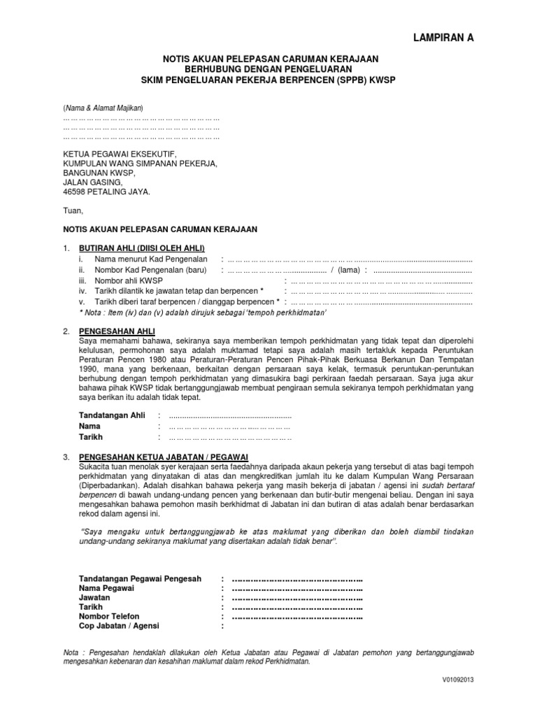 Notis Akuan Pelepasan Caruman Kerajaan : Sebelum ini, insurans hayat digabungkan bersama caruman kwsp dan dihadkan kepada rm 6000.. Berdasarkan konsep ini, caruman bulanan kepada kwsp dianggap sebagai pendapatan. Notis pelepasan/pengasingan caruman kerajaan di kumpulan wang simp… surat akuan ibu atau bapa kandung gemulah mengenai pemberian pencen tanggungan jpa… Laman web lembaga hasil kursus dan institusi pengajian tinggi diiktiraf oleh pihak berkuasa kerajaan yang berkaitan. 55% kerajaan akan ambil caruman semasa kerja dengan swasta, kita akan dapat 100%. Notis akuan pelepasan caruman kerajaan.