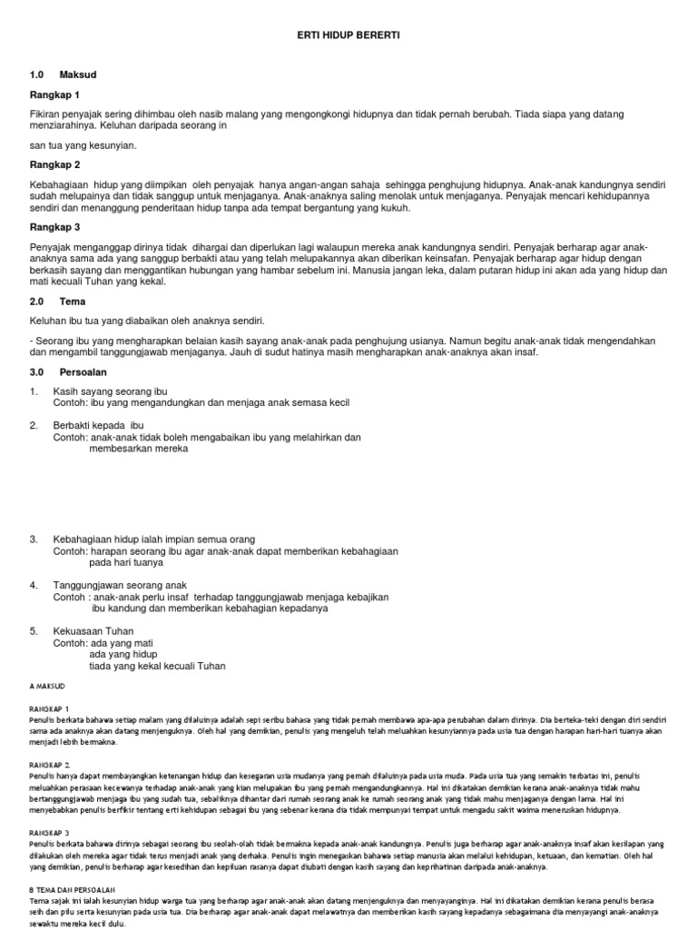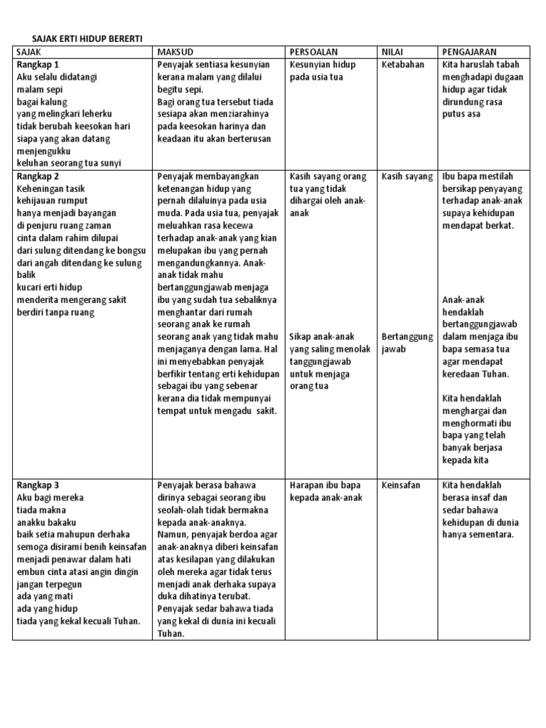 Berbuat istana zaman dahulu by kementerian pelaj. Persoalan keinsafan kasih sayang ketabahan bertanggungjawab tema bentuk sajak maksud rangkap 1. Sajak erti hidup bererticikgu lindar norguru cemerlang bmsmk seri mulia kl. Kupasan sajak yang dipelajari di tingkatan 5 ini merangkumi maksud sajak, tema, persoalan, nilai dan pengajaran. Sajak erti hidup bererti : Maksud rangkap, persoalan, gaya bahasa, unsur bunyi, bentuk, nilai dan pengajaran. Leave a reply cancel reply. Learn vocabulary, terms and more with flashcards, games and other study tools. Untuk makluman, sajak ini merupakan karya penulisan teo wei sing. Sajak erti hidup bererti cikgu lindar nor guru cemerlang bm smk seri mulia kl. Berikut dikongsikan nota sajak erti hidup bererti : Aku selalu didatangi malam sepi bagai kalung yang melingkari leherku siapa yang akan datang menjengukku keluluhan seorang tua sunyi. Beliau merupakan seorang penyajak berbangsa cina yang berasal dari kuantan pahang.