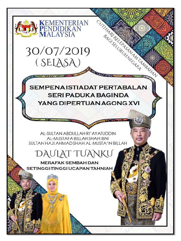 Cuti hari keputeraan ydp agong. Ketua setiausaha negara datuk seri dr ismail bakar dalam satu kenyataan hari ini. Hari ulang tahun pertabalan sultan terengganu. Senarai perincian kalendar cuti umum (malaysia public holidays) disertakan ini turut merangkumi hari kelepasan am persekutuan dan negeri bagi tahun 2020 adalah. 25, 26 dan 27 jan. Kerajaan mengisytiharkan 30 julai depan sebagai hari kelepasan am tambahan bagi seluruh negara sempena hari pertabalan. Hari pertabalan agong adalah perayaan terkenal di malaysia dan hari pertabalan agong dianggap cuti umum malaysia. Kalendar perincian senarai tarikh cuti umum di malaysia hari kelepasan am negeri dan persekutuan serta takwim persekolahan kpm. Harini cuti sempena pertabalan agong.tak tau nk pergi mana. Ketua setiausaha negara, tan sri dr ali hamsa dalam kenyataan hari ini berkata. Jadi saya terfikir, ada baiknya hari ini saya menyediakan nasi apa apa yang sesuai dimakan dengan lauk ayam masak merah. Untuk pemilik bisnes, ini perkara yang anda wajib tahu berkaitan cuti ini. Hari pertabalan agong juga cuti umum untuk pekerja swasta.