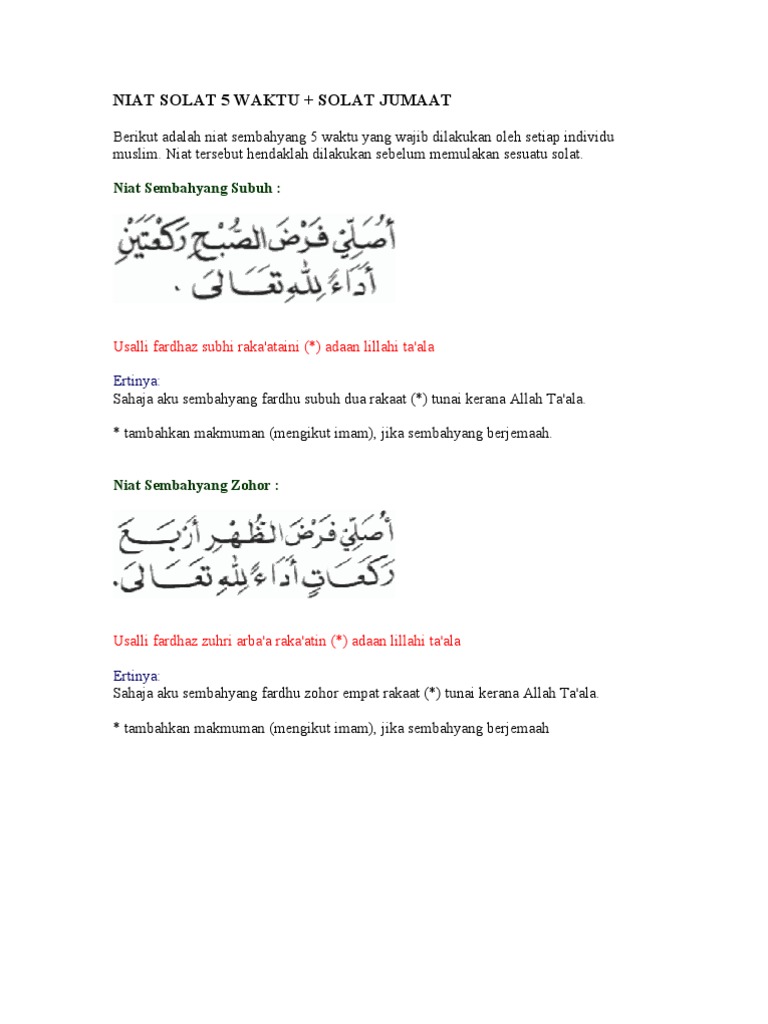 Niat Solat Zuhur : اُصَلّى فَرْضَ الْعِشَاءِ اَرْبَعَ رَكَعَاتٍ مُسْتَقْبِلَ الْقِبْلَةِ اَدَاءً ِللهِ تَعَالَى/ مَأْمُوْمًا ِللهِ تَعَالَى.. Niat dalam solat fardhu seperti solat subuh, zohor, asar, maghrib, isyak dan asar. Sholat menurut bahasa berarti doa. أُصَلِّيْ فَرْضَ الظُّهْرِ رَكْعَتَيْنِ قَصْرًا لِلهِ تَعَالَ. Doa solat dhuha lyric unic. اُصَلِّى سُنَّةَ الصُّبْحِ رَكْعَتَيْنِ قَبْلِيَّةً مُسْتَقْبِلَ الْقِبْلَةِ ِللهِ تَعَالَى.