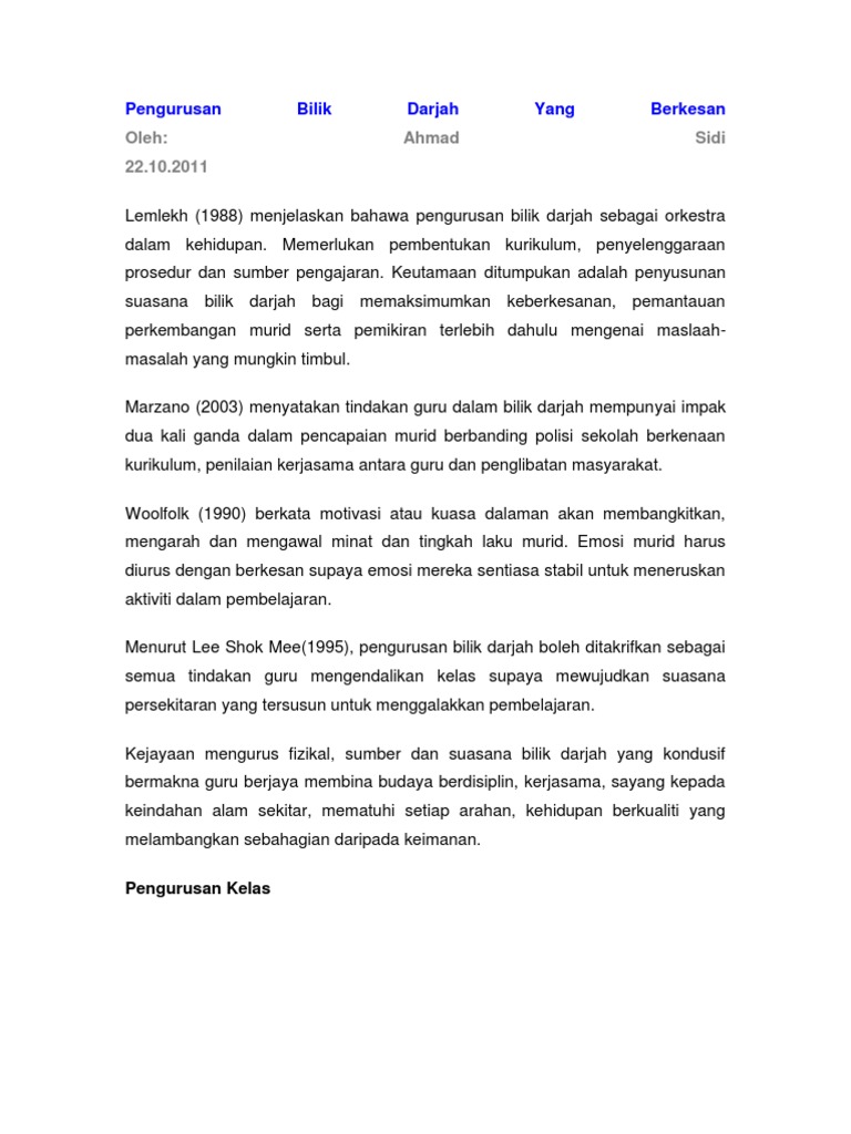 Guru yang efektif akan menguruskan. Menurut lemlech (1988), pengurusan bilik darjah diibaratkan sebagai okestra dalam kehidupan di bilik darjah yang memerlukan pembentukan kurikulum. Sebuah bilik darjah juga seharusnya bersih dan kemas kerana bilik darjah yang tidak teratur mendorong pelajar. Merujuk jacob kounin dalam choong (2009), terdapat lima teknik pengurusan bilik darjah yang boleh diaplikasikan oleh guru bagi mengawal disiplin para murid. Justeru itu, persekitaran bilik darjah yang kondusif dapat menghasilkan pengurusan bilik darjah yang berkesan. Persekitaran bilik darjah yang mendorong pengajaran dan pembelajaran tidak wujud begitu sahaja. 5 pengurusan bilik darjah yang dinamik: Persekitaran yang kondusif dapat membantu mewujudkan keselesaan pengajaran dan pembelajaran di. Persekitaran bilik darjah yang positif a. Persekitaran bilik darjah yang positif tercapai apabila murid dapat melalui proses pembelajaran dengan baik. Murid untuk menyumbang kepada persekitaran pembelajaran yang kondusif d. Persekitaran fizikal bilik darjah adalah penting kerana persekitaran yang kondusif boleh menggalakkan atau menghalang pembelajaran. Menurut marland (1975), suasana fizikal bilik darjah mungkin 1.1 konsep persekitaran bilik darjah yang kondusif persekitaran pembelajaran yang kondusif ialah tempat murid dapat melibatkan diri.